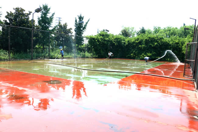 图为后勤人员给场地冲洗打扫