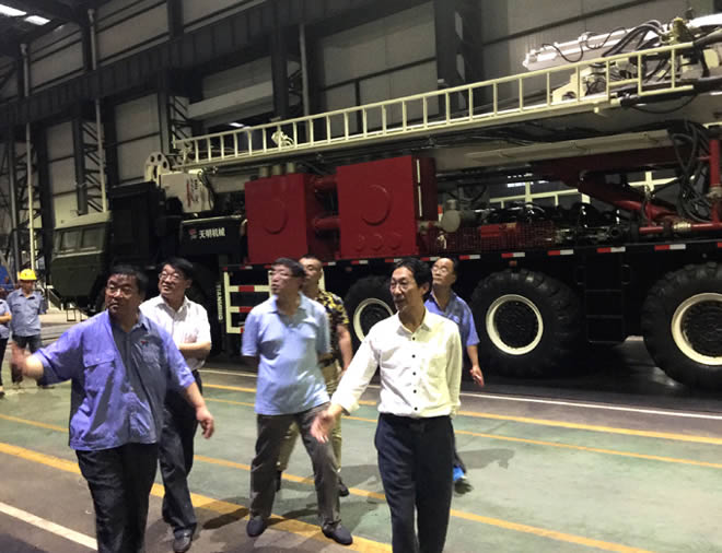 图为张永涛副会长、穆太升总经理在系列智能化车载钻机生产现场考察